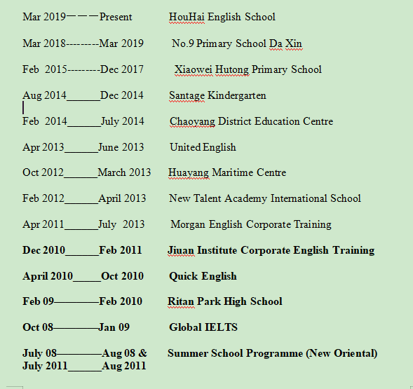 本科,tesol, 教學(xué)經(jīng)驗(yàn)15年以上,在北京朝陽區(qū),大學(xué)老師,求職周中6點(diǎn)以后和周末兼職,薪資協(xié)商,自理工簽 |