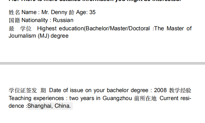 俄羅斯, 碩士, 35歲, 有經(jīng)驗(yàn)3年, 在上海, 在美國(guó)生活過(guò)5年,發(fā)音非常棒,會(huì)談吉他, 求職不限制,商務(wù)簽一年, 求職上海,或者是南方城市,立馬到崗。 -------------也具備所有工作簽證資料。 |