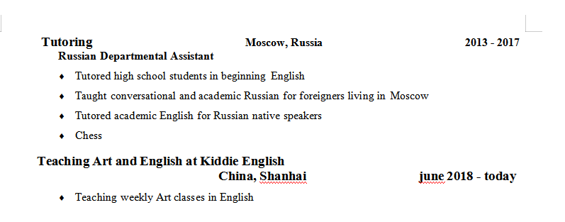 俄羅斯,在上海,本科,商務簽(年底到期,可以申請工簽),曾在美國協(xié)助教授向美國大學生教授英語(2年)盡快到崗,tefl,學過藝術,會4國語言,會跳舞,唱歌,性格熱情開朗 |