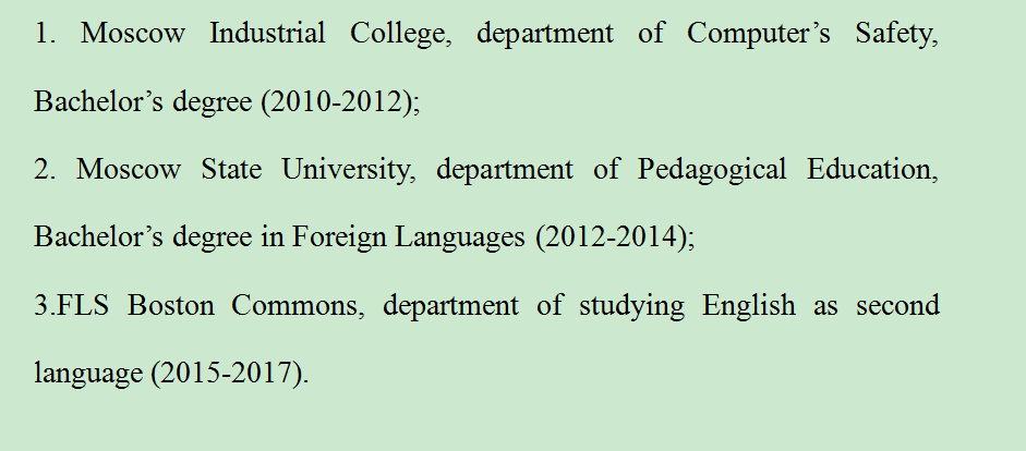1. Bei Lei kindergarten, Yangjiang, China Teacher of English Language (Oct. 2017-Dec.2017) -Planning holiday’s activities; - Preparing lessons. 2. Chain of kindergartens, Yangjiang, China Teacher of English Language (Apr. 2018-Dec.2018) -Organize daily activities; -Planning holiday’s activities; - Preparing lessons. 3. Super Kid International English, Gaozhou, Maoming, China Teacher of English (Jan. 2019-Oct.2019) 4. Chain of kindergartens Maoming. Guangdong Part-time English Teacher (Jul. 2019-Dec.2019)
