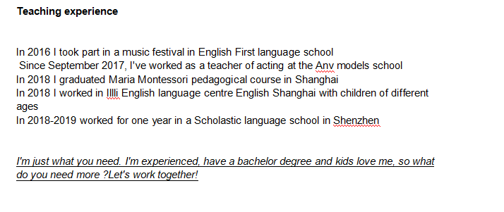 國籍: 俄羅斯 求職意向: 教師