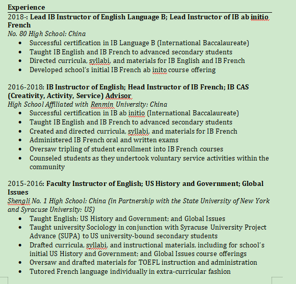 碩士,國際關(guān)系&法國語言文學(xué)雙學(xué)位, 10年以上教學(xué)經(jīng)驗(yàn),CELTA,會法語,阿拉伯語,現(xiàn)于北京高中教學(xué),工簽,求職6月份職位,南方城市,現(xiàn)在薪資30k,根據(jù)城市協(xié)商薪資 |