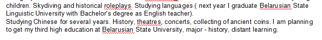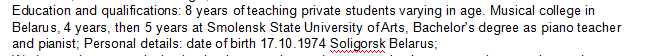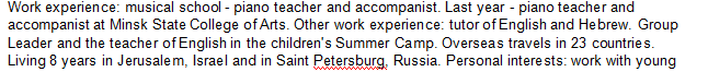 Tim+白俄羅斯男,45歲+鋼琴專業(yè)本科和英語專業(yè)本科+自理商務(wù)簽(新的,一年),工簽資料齊全,可辦理工簽+求職南方城市+目前在本國,2月份到崗~有音樂老師和英語教師經(jīng)驗(有小孩子音樂教學(xué)視頻和大學(xué)音樂教學(xué)視頻),會點漢語 |