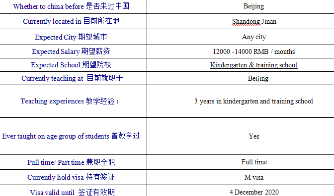 國籍: 英國 求職意向: 教師