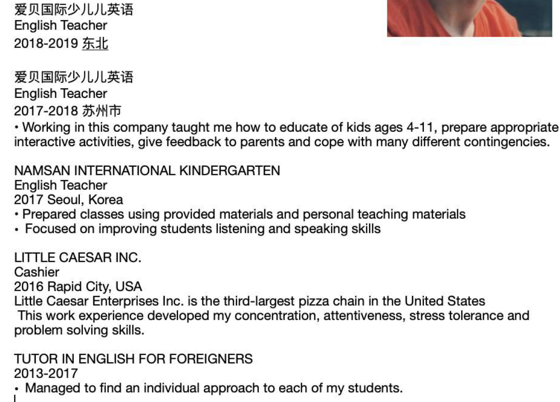 國籍: 俄羅斯 求職意向: 教師