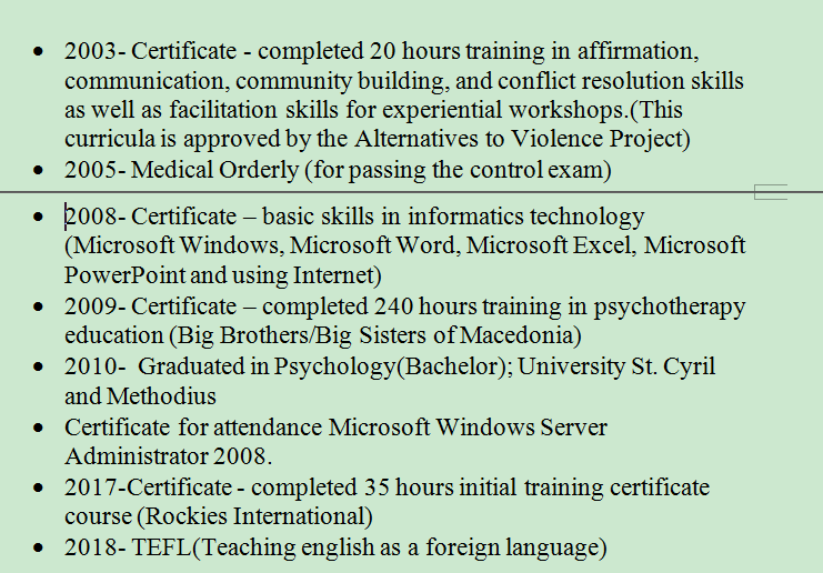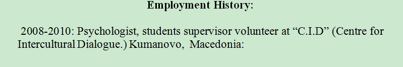 Part time: 2013-2015: Psychotherapy organization “Perfect circle” Skopje, R. Macedonia: