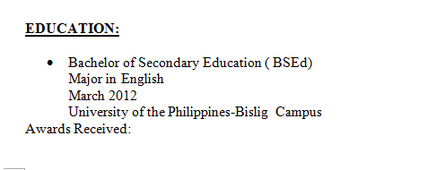 · Handled and Taught 250-300 English Subject to High School students of different Grade Level (Grades 7-10) in a public institution for 3 years. · Undergone different trainings such as Classroom Management and Student Discipline, Evaluating and Assessing the English k-12 Curriculum and a lot more. · Have been a Homeroom Teacher with Grade Levels 7, 8 and 9, Monitors and follow up the students’ behaviour, grades and performances inside and outside the classroom and giving feedbacks to the Parents. · Always on time in preparing and submitting pertinent documents needed by the School Principal like Daily Lesson Plans and the Monthly Class Attendance.