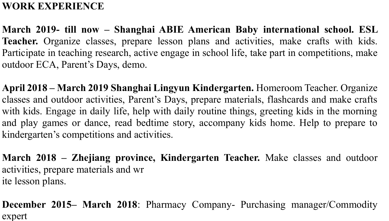 Mary+白俄羅斯女+2年中國教學經(jīng)驗(浙江和上海)本科+自理商務簽(2020.12到期),工簽資料除了體檢,其他都有+求職上海+目前在上海,可盡快到崗(要至少17k)