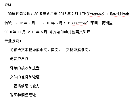 俄羅斯, 在上海, 商務(wù)簽證 2月中旬到, 或者是現(xiàn)在到, 過年期間延期簽證, 有經(jīng)驗(yàn), 媽媽在上海工作, 求職上海附近職位, 年前年后到崗 都可以, 發(fā)音很棒, 會(huì)漢語。 上海附近 12k+住宿 |