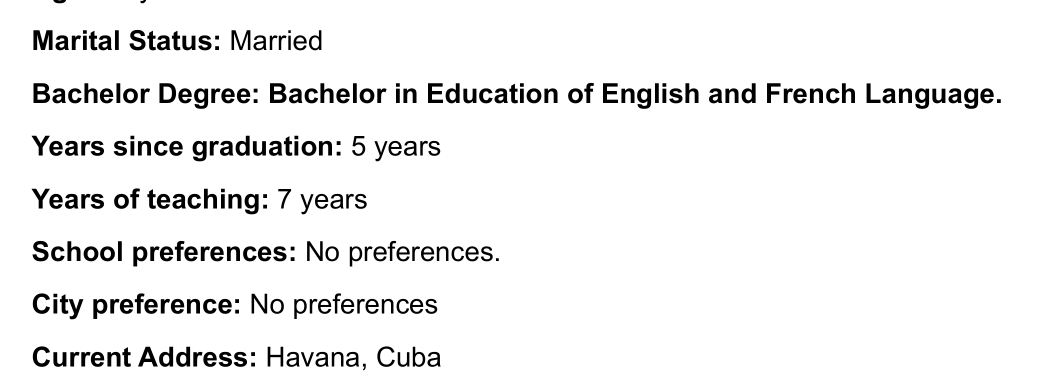 Elena Alvarez+古巴女+英語和法語教育本科,有TEFL+7年教學(xué)經(jīng)驗+工簽資料齊全(辦理工簽)+求職地點不限+目前在本國,辦好工簽到崗~發(fā)音好(丈夫需要家庭簽證。她會先來中國,然后帶丈夫) |