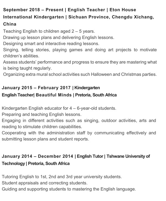 國籍: 南非 求職意向: 教師