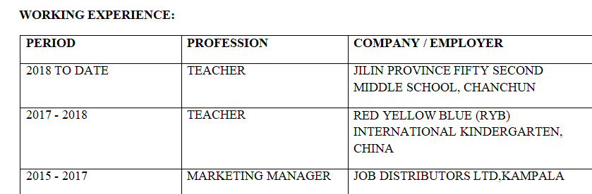 烏干達 本科--教育專業(yè),經(jīng)驗4年。經(jīng)濟類工簽可以自理, 到2020.11 , 在煙臺, 求職不限制 |