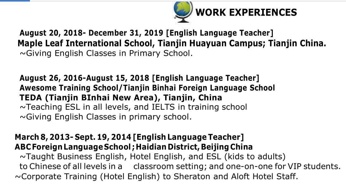 Melody+菲律賓女+英語(yǔ)文學(xué)專(zhuān)業(yè)本科+工簽資料齊全+求職天津+目前在本國(guó),2月份到崗~工作經(jīng)驗(yàn)豐富(9年中國(guó)教學(xué)經(jīng)驗(yàn)。一共13年教學(xué)經(jīng)歷),發(fā)音很好 |