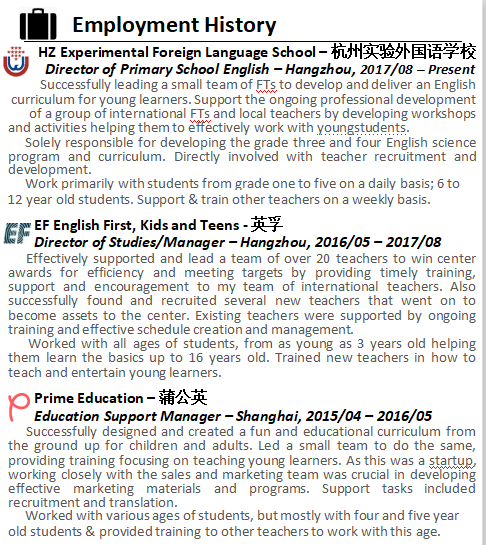 本科國際商務(wù)專業(yè),有TEFL,教學(xué)經(jīng)驗10年以上,也有管理經(jīng)驗,現(xiàn)于杭州,求職9月份管理崗位工作,不低于現(xiàn)在薪資35k 有個女兒,希望能解決女兒上小學(xué)問題 |