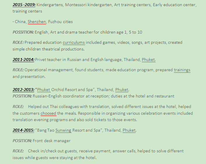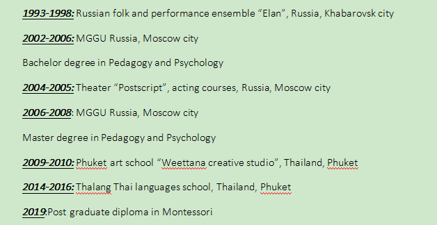 教育學(xué)碩士,經(jīng)驗十分豐富,教過藝術(shù),戲劇,發(fā)音很好,有蒙臺梭利教育證書 |