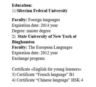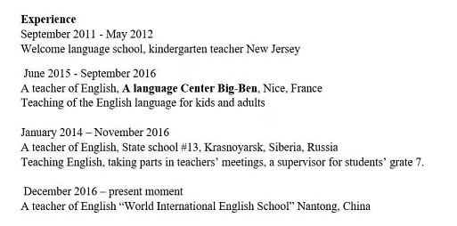 美國生活的 有7年教學經驗,有tefl ,漢語、法語、西班牙語、英語和俄語 |