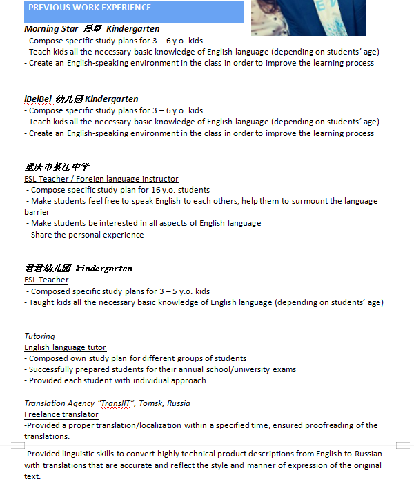 國籍: 俄羅斯 求職意向: 教師