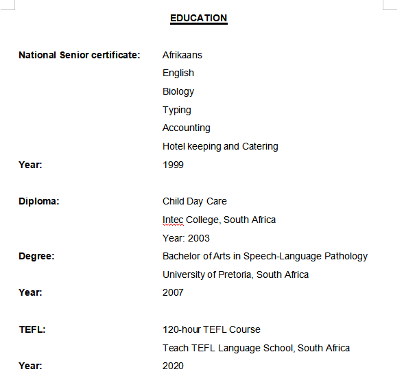 國籍: 南非 求職意向: 教師
