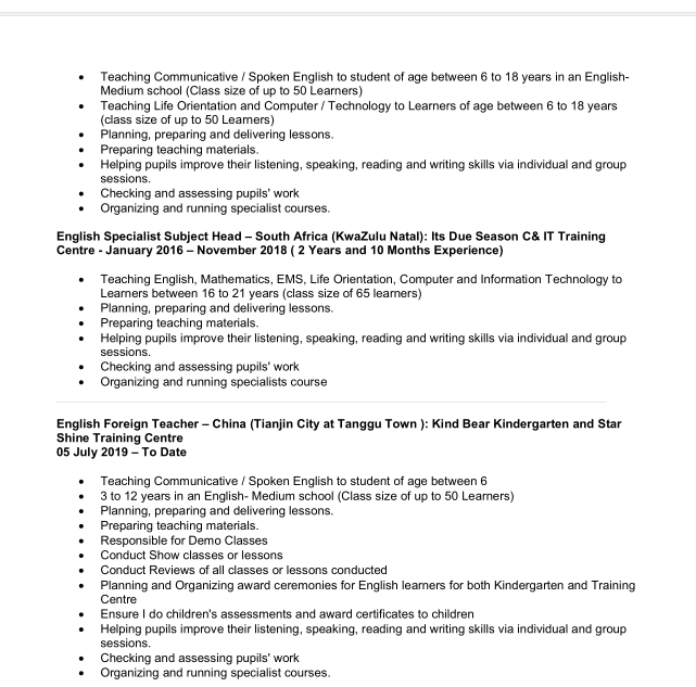 國(guó)籍: 南非 求職意向: 教師