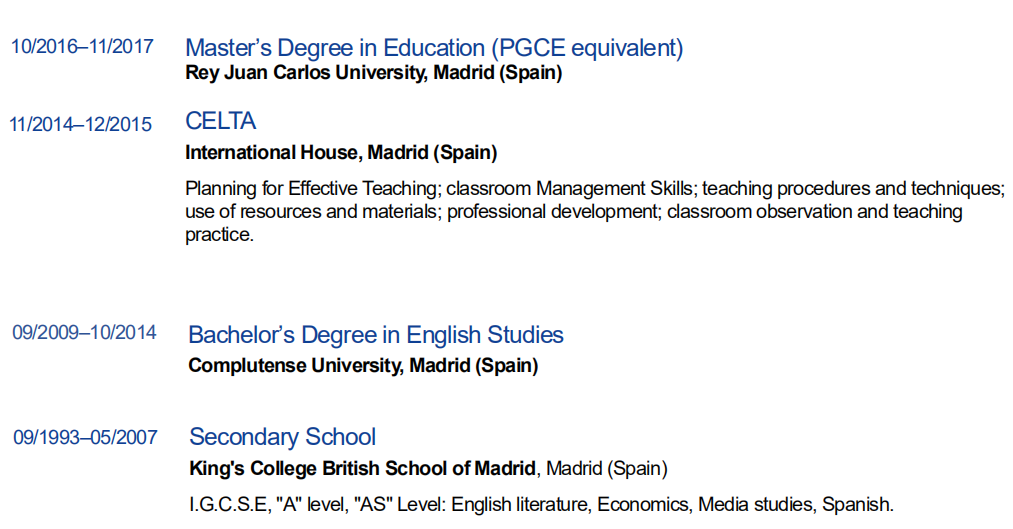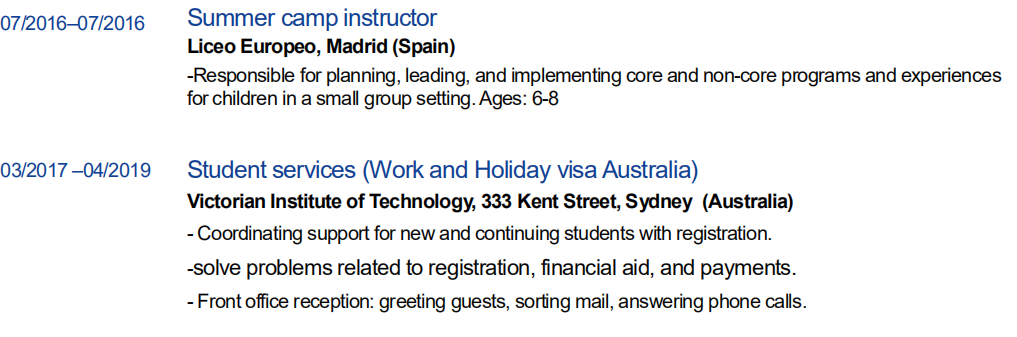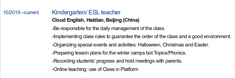 西班牙女,教育專業(yè)碩士,有CELTA;2017-2019年,在澳大利亞悉尼肯特街333號維多利亞理工學院和澳大利亞悉尼皮特街9/280號麻省理工學院實習,北京海淀云英語教學一年,負責班級的日常管理;執(zhí)行班級規(guī)則,以保證班級秩序和良好的環(huán)境;組織特別活動:萬圣節(jié)、圣誕節(jié)和復活節(jié);為冬令營機器人主題/自然拼音準備教案;記錄學生的進步,并與家長舉行會議;在線教學:在平臺上使用課堂。 |