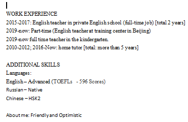 外教現(xiàn)在北京 是俄羅斯與澳大利亞混血 在澳大利亞取得本科 有五年教學(xué)經(jīng)驗 漢語二級 |