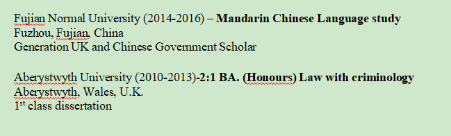 本科犯罪學(xué),TEFL,漢語5級(jí) |