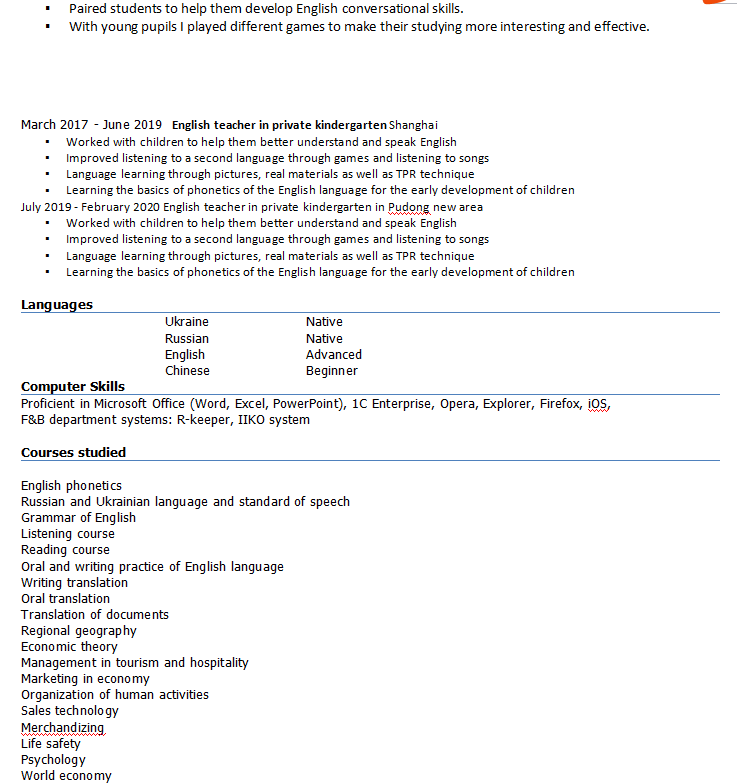 烏克蘭, 管理本科, 經(jīng)驗(yàn)涉及幼兒園,公立和培訓(xùn)班, 發(fā)音非常好 。求職不限制。 |