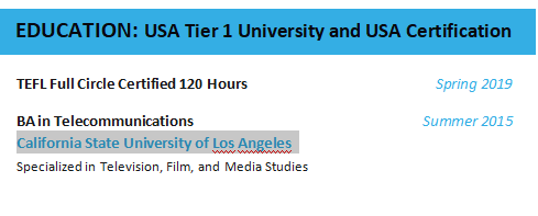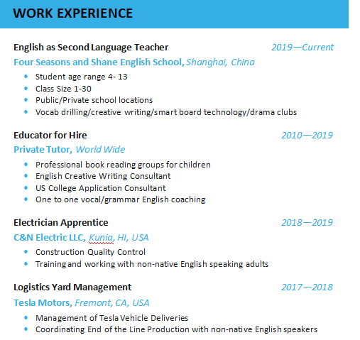 美國, 在上海,本科, tefl120小時(shí), 工作簽證轉(zhuǎn)聘在8月, 求職下學(xué)期公立和幼兒園職位, 大學(xué)也考慮,經(jīng)驗(yàn)11 年。 美國加州大學(xué)洛杉磯分校。 不限制城市。 |