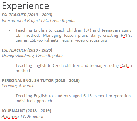 亞美尼亞, 英語語言本科2017年畢業(yè)。 tefl 經(jīng)驗(yàn)4年 發(fā)音不錯(cuò), 性格nice , |