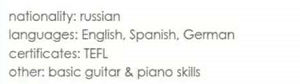 有tefl ,會彈鋼琴,吉他, 教學經(jīng)驗豐富,有本科 |