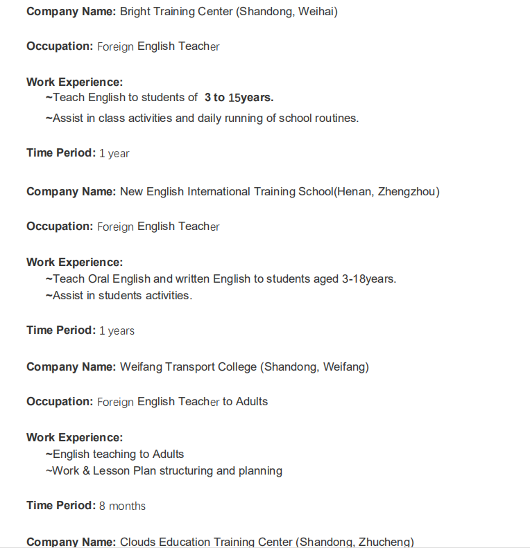 南非, 本科 在江蘇南通, 山東威海, 濰坊都工作過,求職不限制, |