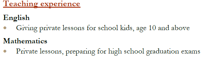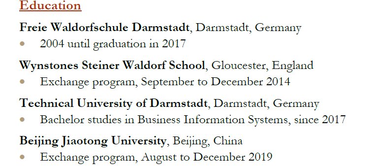 教育 德國達(dá)姆施塔特的弗雷·瓦爾多夫施勒·達(dá)姆施塔特 ?2004年至2017年畢業(yè) 英國格洛斯特的Wynstones Steiner Waldorf學(xué)校 ?交流項(xiàng)目,2014年9月至12月 德國達(dá)姆施塔特市達(dá)姆施塔特工業(yè)大學(xué) ?自2017年開始,本科學(xué)習(xí)商業(yè)信息系統(tǒng) 北京交通大學(xué),北京,中國 ?交流項(xiàng)目,2019年8月至12月 教學(xué)經(jīng)驗(yàn) 英語 ?為10歲及以上的學(xué)生提供私人課程 數(shù)學(xué) ?私人課程,準(zhǔn)備高中畢業(yè)考試 |