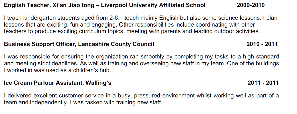 2009-2010年,西安交通大學(xué)利物浦大學(xué)附屬中學(xué)英語(yǔ)教師 我教2-6歲的幼兒園學(xué)生。我主要教英語(yǔ),但也教一些科學(xué)課程。我計(jì)劃 課程是令人興奮的,有趣的和有吸引力的。其他職責(zé)包括與他人協(xié)調(diào) 教師制作令人興奮的課程主題,與家長(zhǎng)見(jiàn)面和領(lǐng)導(dǎo)戶外活動(dòng)。 商業(yè)支持官員,蘭開夏郡議會(huì)2010 - 2011年 我的職責(zé)是高標(biāo)準(zhǔn)地完成我的任務(wù),確保組織平穩(wěn)運(yùn)行 并嚴(yán)格遵守最后期限。以及培訓(xùn)和監(jiān)督我的團(tuán)隊(duì)中的新員工。其中一棟建筑 我工作的地方被用作兒童活動(dòng)中心。 冰淇淋店助理,沃林的2011 - 2011年 |