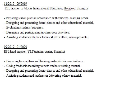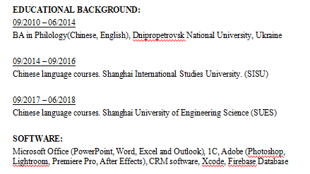 教育背景: 09/2010 - 06/2014 烏克蘭第聶伯羅彼得羅夫斯克國立大學(xué)語文學(xué)學(xué)士(中文、英文) 09/2014 - 09/2016 中國的語言課程。上海外國語大學(xué)。(上海) 09/2017 - 06/2018 中國的語言課程。上海工程技術(shù)大學(xué) 工作經(jīng)歷: 英語老師。e座國際教育,上海虹口 -根據(jù)學(xué)生的學(xué)習(xí)需要準(zhǔn)備教案。 -設(shè)計(jì)和演示演示課程和其他教育材料。 11/2015 - 09/2019 英語老師。e座國際教育,上海虹口 -根據(jù)學(xué)生的學(xué)習(xí)需要準(zhǔn)備教案。 -設(shè)計(jì)和演示演示課程和其他教育材料。 評估學(xué)生的進(jìn)步。 -設(shè)計(jì)并參與課堂活動。 -盡可能協(xié)助學(xué)生解決技術(shù)上的困難。 09/2019 - 01/2020 英語班主任。 YLT培訓(xùn)中心,上海 -為新教師準(zhǔn)備教案和培訓(xùn)材料。 根據(jù)新教師培訓(xùn)手冊給予反饋。 -設(shè)計(jì)和演示演示課程和其他教育材料。 -協(xié)助學(xué)生和老師提交新材料。 |