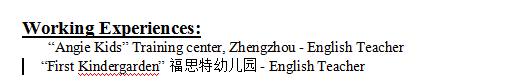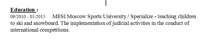 工作經(jīng)驗:鄭州“安吉小子”培訓(xùn)中心-英語老師 “第一幼兒園”福思特幼兒園-英語老師 教育 : 09/2010-05/2015 MESI莫斯科體育大學(xué)/專業(yè)-教孩子們滑雪和滑雪板。 在進(jìn)行國際比賽中進(jìn)行司法活動。 |