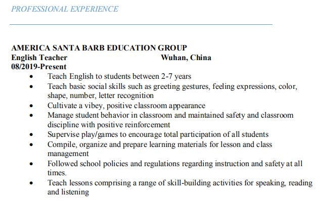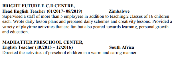 工作經(jīng)驗: 在中國武漢工作 教授2-7歲孩子(2019年至今) 在津巴布韋做班主任老師(2017-2019) 在南非做英文老師(2015-2016) 資格 會計本科 TEFL |