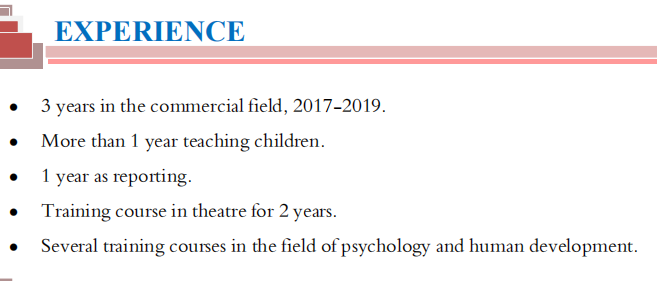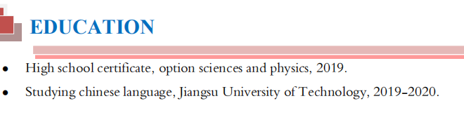 教育 ? High 學(xué)校 certificate, 選擇 科學(xué) 和 physics, 2019. ? 江蘇科技大學(xué)學(xué)漢語 2019 - 2020. 經(jīng)驗 ? 3 年 在 商業(yè) 領(lǐng)域, 2017 - 2019. ? 1 年 多教學(xué)經(jīng)驗 ? 報告工作 1 年 ? 2年多培訓(xùn)經(jīng)驗 ? 在幾個 心理學(xué) 和 人類 的 發(fā)展培訓(xùn)機(jī)構(gòu)的工作今年關(guān)于 |