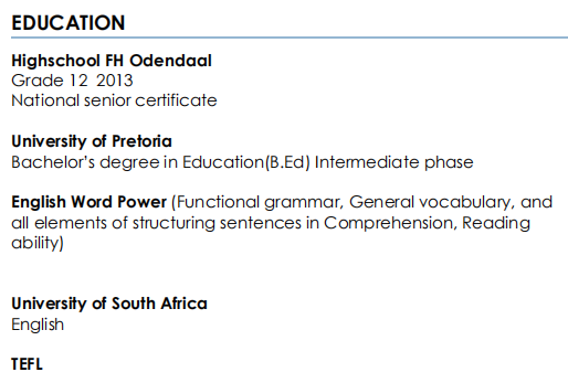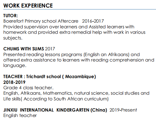 教育背景: 本科教育專業(yè) 南非大學(xué) 有TEFL 工作經(jīng)驗(yàn): 2016-2019年在國(guó)外做英文老師(教小學(xué) ,可以教其他科目) 2019-至今在中國(guó)做英文老師(幼兒園) ” |