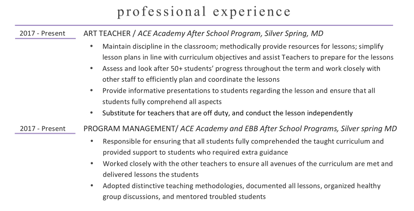 國際管理學碩士 加州大學舊金山分校 2019 年獲得TESOL(第二英語教學語言)證書 有藝術教師和英語教師的教學經(jīng)驗, 有經(jīng)過驗證的組織,指導和輔導技巧。 在提高英語水平方面擁有良好的語言教學和有效藝術創(chuàng)作能力。 團隊合作能力意識強希望在學校中貢獻知識和技能為職業(yè)發(fā)展提供了真正的機會! |
