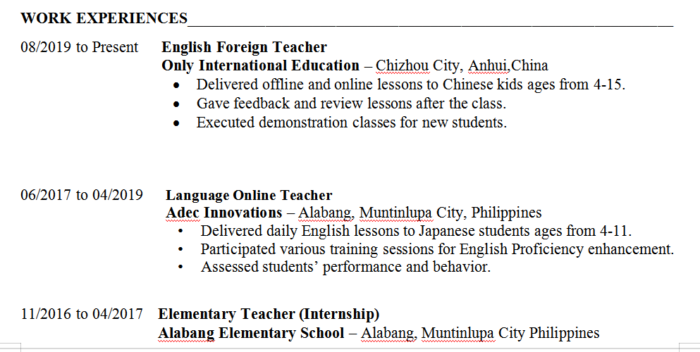 06/2017至04/2019語言在線老師 Adec Innovations –菲律賓文珍俞巴市阿拉邦,每天為4-11歲的日本學(xué)生提供英語課。 11/2016至04/2017小學(xué)教師 工作簽證轉(zhuǎn)聘 |