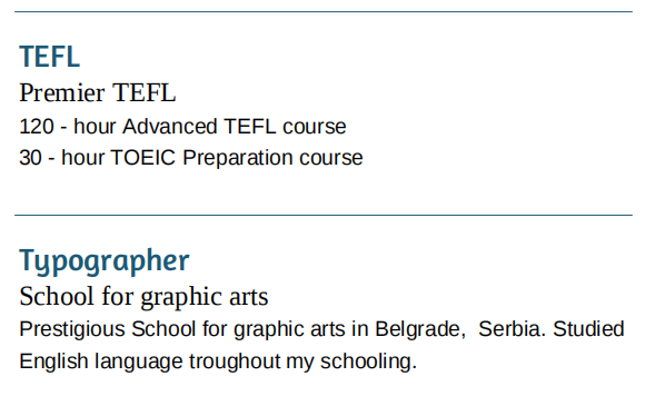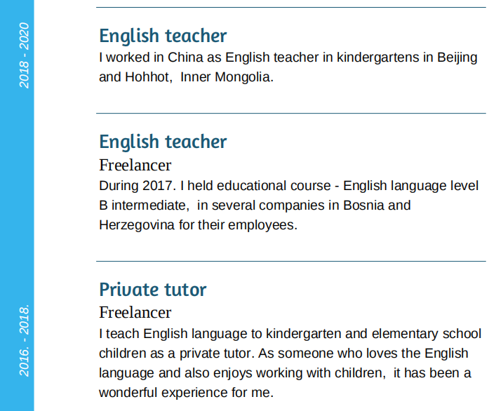 120小時(shí)高級(jí)英語(yǔ)教學(xué)課程,30時(shí)托業(yè)考試準(zhǔn)備課程---tefl;塞爾維亞貝爾格萊德著名的平面藝術(shù)學(xué)校本科畢業(yè)。 2018-2020,英語(yǔ)老師 ,北京的幼兒園當(dāng)英語(yǔ)老師以及蒙古呼和浩特; 2017年期間,英語(yǔ)老師自由記者,參加了教育課程——英語(yǔ) 中級(jí)(斯尼亞和黑塞哥維那) 2016-2018,私人家庭教師 |