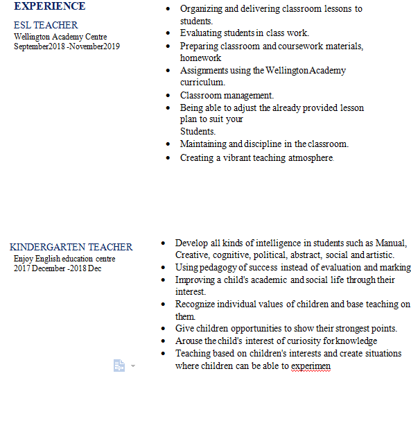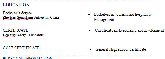 教育 學(xué)士學(xué)位 浙江工商大學(xué),中國 證書 津巴布韋德馬克學(xué)院 GCSE證書 旅游和酒店管理學(xué)士 工作經(jīng)歷: ESL老師 :惠靈頓學(xué)院中心 2018年9月-2019年11月 幼兒園老師 英語教師: 享受英語教育中心 2017年12月-2018 |