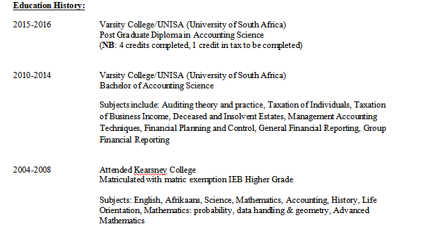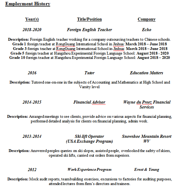 學(xué)習(xí)經(jīng)歷: 2015-2016大學(xué)/ UNISA(南非大學(xué)) 會(huì)計(jì)學(xué)研究生文憑 2010-2014大學(xué)/ UNISA(南非大學(xué)) 會(huì)計(jì)學(xué)學(xué)士 2004-2008年就讀于科爾斯尼學(xué)院 擁有免修IEB更高等級(jí)的大學(xué)入學(xué) 工作經(jīng)歷 年份職務(wù)/職位公司 2018-2020外語英語教師 描述:在公司工作的外籍英語老師將老師外包給中文學(xué)校。 工作經(jīng)歷 :金華榮光國際學(xué)校一年級(jí)外國老師:2018年3月– 2018年6月 金華榮光國際學(xué)校三年級(jí)外國老師:2018年3月– 2018年6月 杭州實(shí)驗(yàn)外國語學(xué)校五年級(jí)外國老師:2018年8月-2020年 杭州實(shí)驗(yàn)外國語學(xué)校十年級(jí)外國老師:2018年8月– 2020年 |