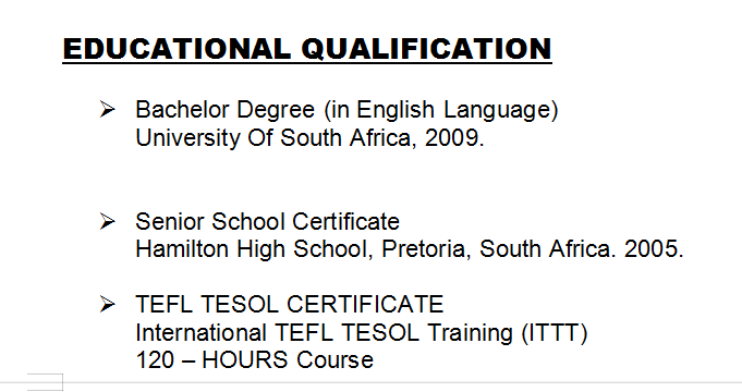 -學(xué)士學(xué)位(英語) 南非大學(xué),2009年。 高級中學(xué)證書 南非比勒陀利亞漢密爾頓高中。 2005 TEFLTESOL證書 國際TEFL TESOL培訓(xùn)(ITTT) 120 小時課程 國際學(xué)校鼎盛成長幼兒園的英語老師。 年齡:2-6 開始日期:2018年7月–直到現(xiàn)在 我的職責(zé)是 ?規(guī)劃,實(shí)施和評估課程。 ?用耐心和創(chuàng)造力教孩子們。 ?教授基本技能,例如顏色,形狀,數(shù)字和字母識別,個人衛(wèi)生和社交技能。 ?為全班或小組閱讀書籍。 ?為課堂活動準(zhǔn)備材料和教室。 ·教導(dǎo)正確的飲食習(xí)慣和個人衛(wèi)生。 ?半天的班主任的責(zé)任。 ?與其他團(tuán)隊(duì)成員以及與家長交流有關(guān)學(xué)生的進(jìn)步和行為。 ?開發(fā)并實(shí)施合適的教室管理系統(tǒng)。 ?音樂和運(yùn)動活動。 中國河北省承德市外國語初中和高中英語老師。 開課日期:2015年9月– 2018年6月 我的職責(zé)是 ?創(chuàng)建課程計(jì)劃,并向全班教授這些計(jì)劃 有趣有趣的英語教學(xué) ?幫助學(xué)生提高聽力,口語和閱讀能力 評估學(xué)生以評估他們的能力,優(yōu)點(diǎn)和缺點(diǎn) 參加學(xué)?;顒?/p> ?準(zhǔn)備學(xué)生參加國家要求的標(biāo)準(zhǔn)化考試 ?幫助學(xué)生掌握英語難點(diǎn)單詞 ?對學(xué)生的作業(yè)進(jìn)行評分,以監(jiān)控他們的進(jìn)度 ?與學(xué)生清晰,緩慢地交談 音樂,演奏時間 |