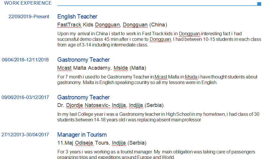 22/09 / 2019–現(xiàn)在的英語(yǔ)老師 FastTrack Kids東莞,東莞(中國(guó)) 06/04 / 2018–12 / 11/2018美食老師 Mcast馬耳他學(xué)院,Msida(馬耳他 2016/09 / 06–03 / 12/2017美食老師 01/09 / 2007–11 / 06/2010獲得第二級(jí)教育EQF級(jí)別的文憑