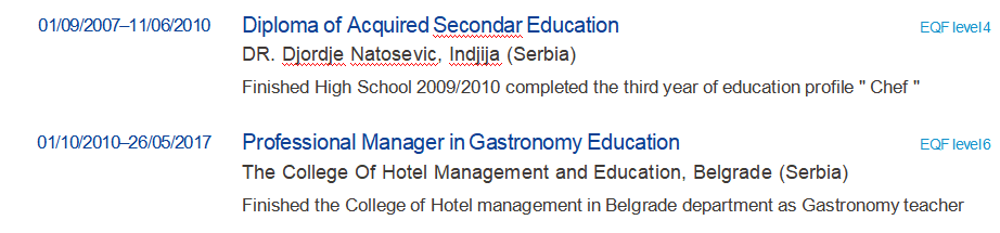 01/10 / 2010–26 / 05/2017美食教育EQF 6級(jí)專(zhuān)業(yè)經(jīng)理 貝爾格萊德酒店管理與教育學(xué)院(塞爾維亞) 完成貝爾格萊德系酒店管理學(xué)院的美食老師 |