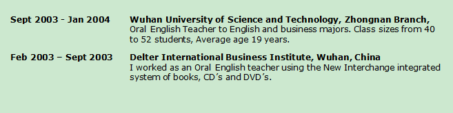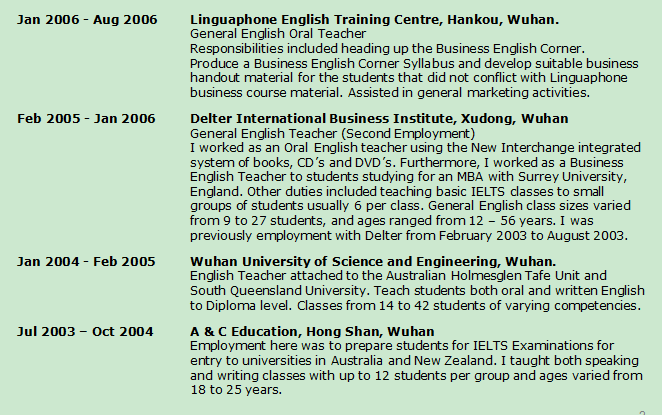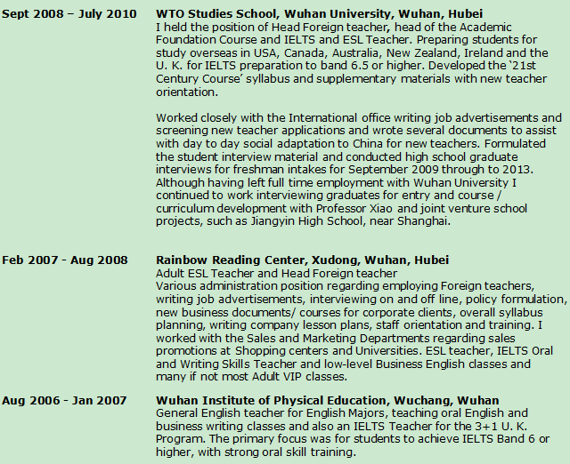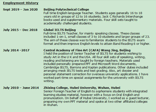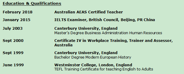 2018年2月澳大利亞AEAS認證教師 ,2015年1月中國北京英國文化協(xié)會雅思考官; 2003年7月英格蘭安特伯里大學 ,工商管理碩士人力資源; 2000年9月工作場所培訓、培訓師和評估員證書, 澳大利亞; 1999年9月英格蘭坎特伯雷大學 ,學士學位:現(xiàn)代歐洲歷史; 1999年6月英國倫敦威斯敏斯特學院 ,成人英語教學英語培訓證書。 2019年9月-2020年1月北京理工大學 全職英語教師。學生年齡一般在16至18歲之間,每組12至16名學生。杰克·理查茲交換使用的書籍和補充材料。向學業(yè)有困難的學生傳授四種技能。 2015年7月-2018年12月北京國際雅思 全日制雅思教師,主要用于口語課。這些班級包括一對一、3到10人的小班和23人的大組。這些課程的目的是讓學生熟悉雅思考試形式,然后提高英語水平達到六級或更高。 2014年7月-2017年中央美術學院(CAFA)王靜,北京 我曾擔任雅思高級教師,面向希望在英國和美國學習藝術的學生??谡Z、寫作、閱讀和聽力這四項技能都是由外教教授的。使用的材料包括個人準備的PPT和微軟Word文檔、劍橋雅思、巴倫和卡普蘭出版物。其他職責包括安排模擬雅思考試和考試評分。此外,藝術檔案和個人聲明的海外大學申請更正。我在大學里兼職完成雅思寫作的特殊任務。 |
