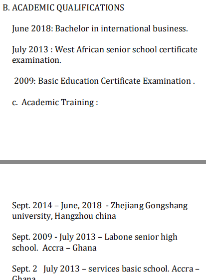 學(xué)歷 2018年6月:國(guó)際商務(wù)學(xué)士。 2013年7月:西非高中畢業(yè)證書 2009年:拿到基礎(chǔ)教育證書。 2014年9月- 2018年6月-浙江工商杭州大學(xué),中國(guó) 2009年9月- 2013年7月-拉邦高中學(xué)校。阿克拉,加納 2013年7月2日-服務(wù)基礎(chǔ)學(xué)校。阿克拉-加納