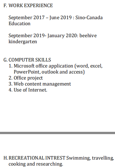 工作經(jīng)驗(yàn) 2017年9月- 2019年6月:中加合作教育 幼兒園 |