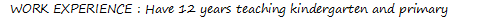 學歷: 高中/ 專業(yè)畢業(yè)/ 學士學位 工作經驗: 有12年幼兒園和小學教學經驗 |